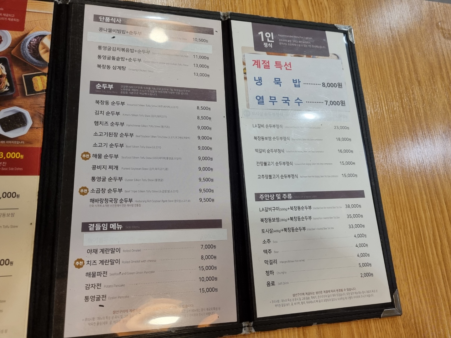북창동보쌈 순두부정식 18,000원떡갈비 순두부정식 16,000원간장불고기 순두부정식 15,000원고추장불고기 순두부정식 15,000원