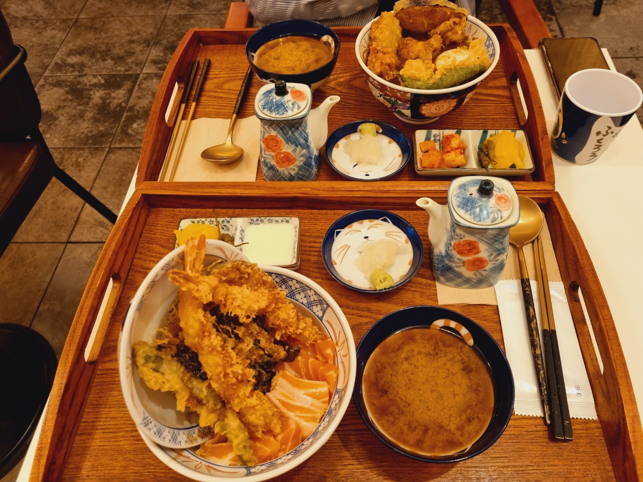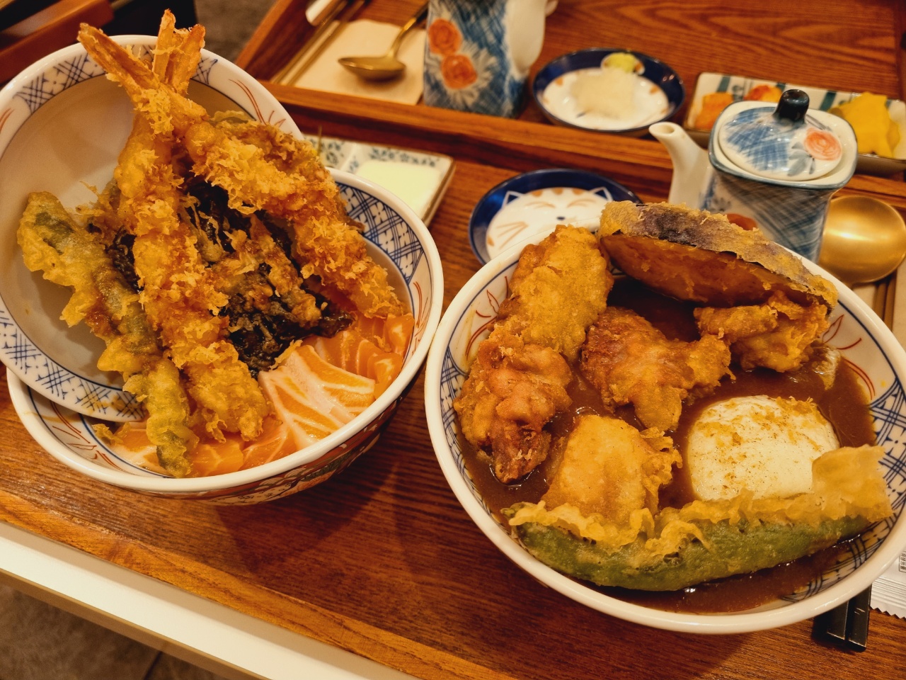 사케 에비 텐동과 가라아게 카레 텐동을