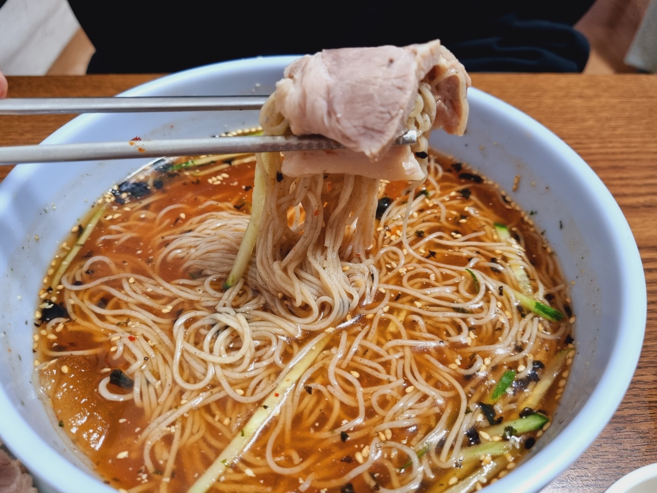 장원막국수 국물 한 입 하는 순간