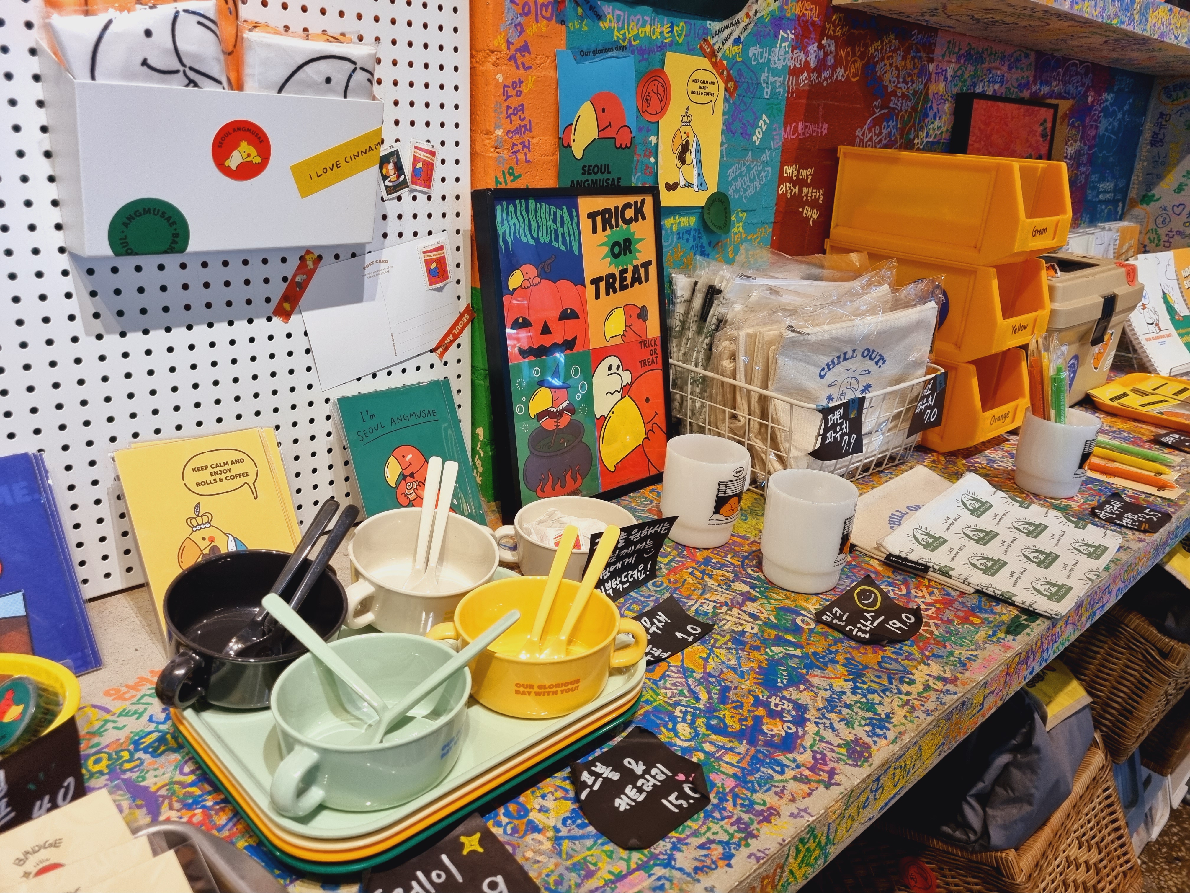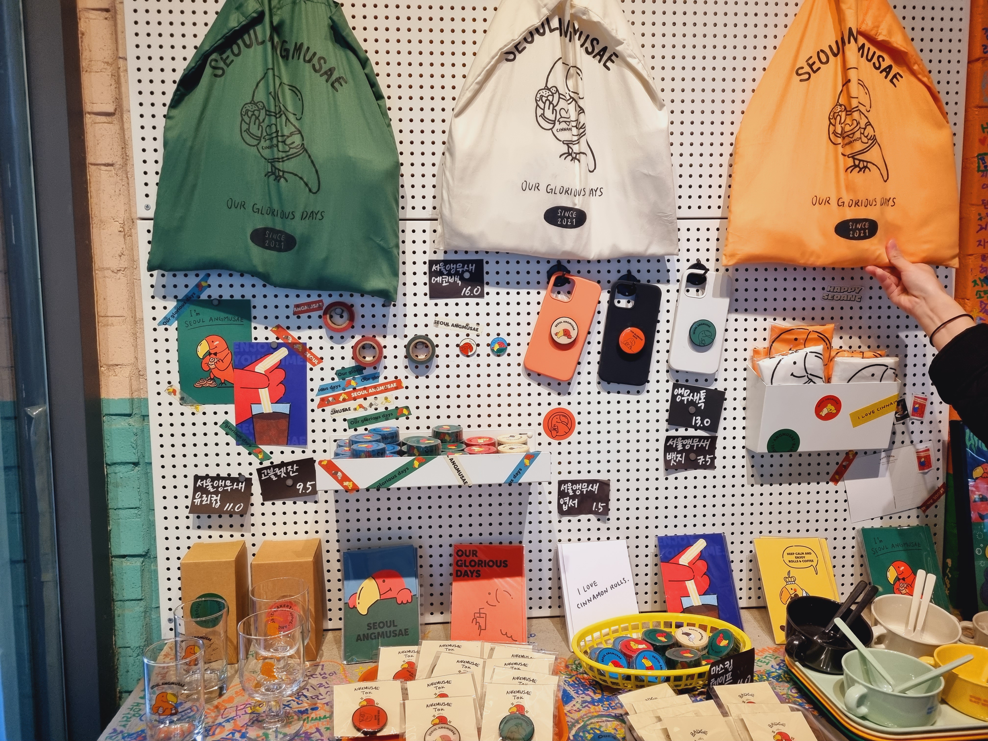 서울앵무새 굿즈들이 전시되어 있는데요!